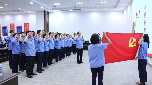 (黨支部書(shū)記、董事長(zhǎng)王煥一領(lǐng)誓) “起來(lái),不愿做奴隸的人們……”在嘹亮而莊嚴(yán)的國(guó)歌聲中,大會(huì)正式開(kāi)始!拔抑驹讣尤胫袊(guó)共產(chǎn)黨,擁護(hù)黨的綱領(lǐng),遵守黨的章程……”在公司黨支部書(shū)記、董事長(zhǎng)王煥一領(lǐng)誓下,全體黨員重溫入黨誓詞,堅(jiān)定有力的聲音響徹全場(chǎng)。